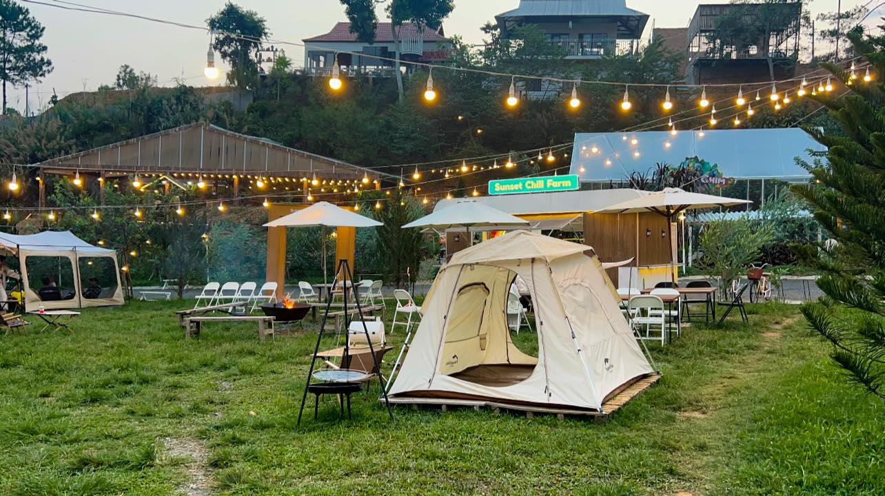 Tham Quan check in Sunset Farm. Sunset Chill Coffee là quán cà phê tọa lạc trên Đồi Gió. Đúng như tên gọi, tại đây bạn có thể thưởng thức khoảnh khắc hoàng hôn tuyệt đẹp buông xuống từ trên cao nhuộm hồng cảnh quan của thành phố hương trà Bảo Lộc xinh đẹp này.