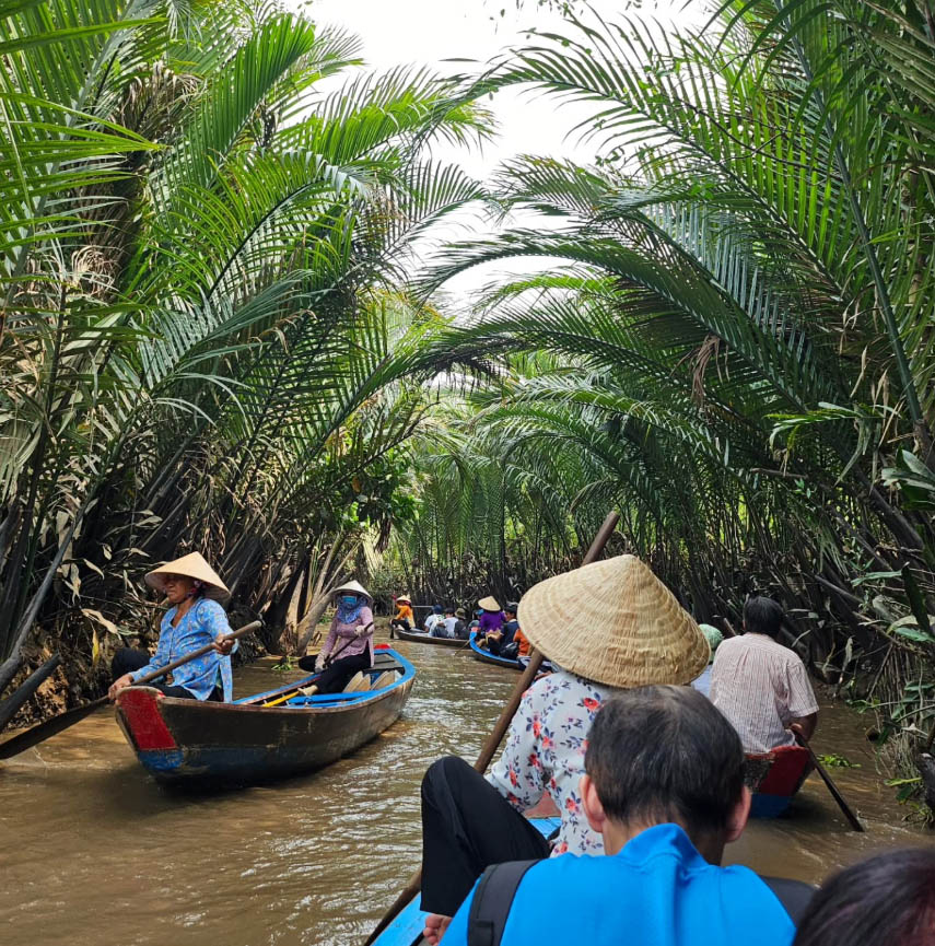 Du khách tiếp tục chèo xuồng ba lá, len lỏi vào các con rạch nhỏ hòa mình vào khung cảnh thiên nhiên dưới tán lá của những hàng dừa nước 🡪 Thưởng thức trái cây tươi, nghe những giai điệu Đờn ca tài tử đi vào lòng người.