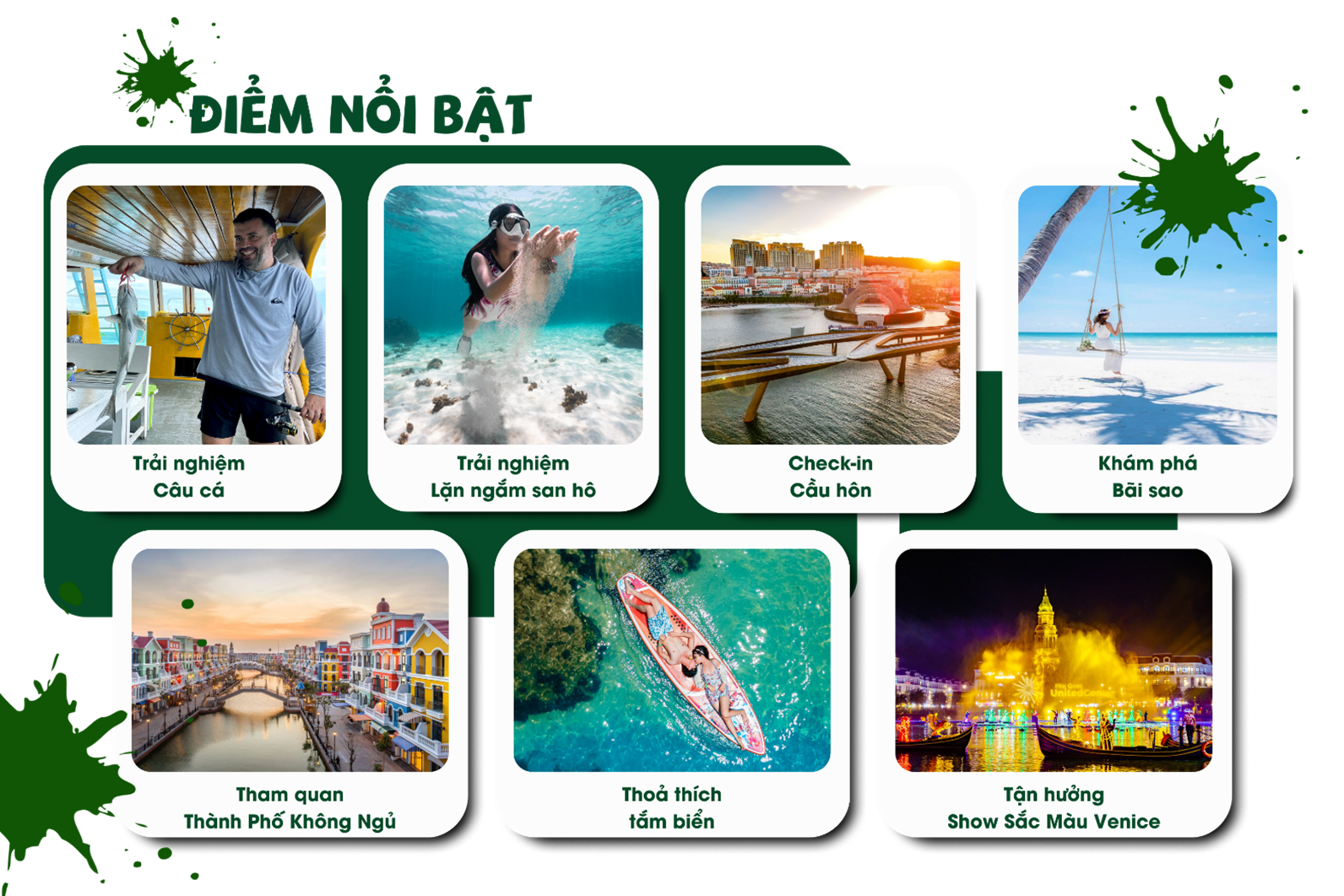 • Tận hưởng cảm hứng Châu Âu qua show diễn Sắc màu Venice: Show diễn miễn phí, tái hiện câu chuyện tình yêu lãng mạn trong không gian Châu Âu.
