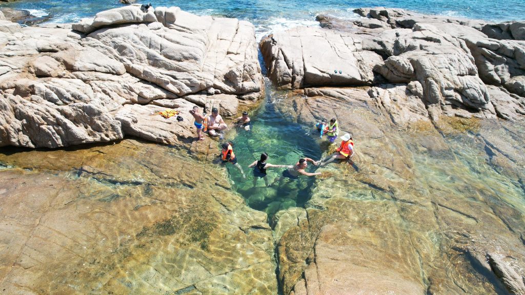 – Di chuyển (đi bộ) băng qua rừng cây hoang sơ đến hồ bơi vô cực. Tự dó chụp ảnh, lặn san hô (áo phao + kính lặn)