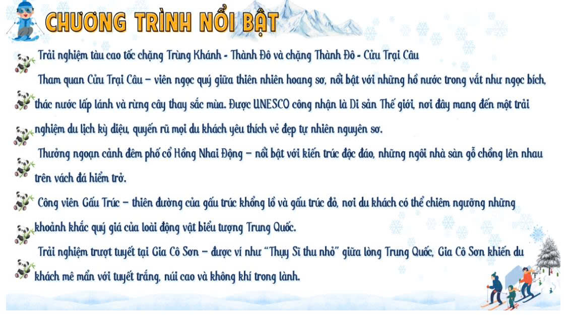 – Công viên Gấu Trúc Công viên gấu trúc Thành Đô. Nơi đây được coi như là ngôi nhà thiên đường dành cho gấu trúc – loài động vật đáng yêu đang trên đà tuyệt chủng. (bao gồm xe điện công cộng tham quan bên trong)